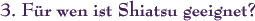 Shiatsu wird praktiziert, um eine Balance der Lebenskraft zu schaffen und zu erhalten. Mit seiner ruhigen und entspannten Arbeitsweise, einer spezifischen Qualität von Druck, regt Shiatsu den Energiefluss an und fördert so die körperliche und seelische Ausgeglichenheit. Zusätzlich werden Techniken eingesetzt wie Dehnungen, Rotationen u. a. die Anregung und Harmonisierung des Energieflusses verbessert die Körperwahrnehmung und stärkt das Vertrauen in die Selbst-Regulierungskräfte des Organismus. Nach einer Shiatsu-Behandlung fühlen sich die KlientInnen i. d. R. leichter, ausgeglichener und gelassener. Es können sich Blockaden auflösen, die sich beispielsweise als Verspannungen, Steifheit oder schmerzende Bereiche im Körper bemerkbar machen oder auch als emotionale Verstimmungen die Psyche beeinflussen. Außerdem unterstützt Shiatsu wirkungsvoll eine Vielzahl verschiedenster Heilmaßnahmen, denn durch das Fließen der Lebensenergie ist es dem Körper möglich, die ihm eigenen (Heil-) Kräfte zu mobilisieren. In der heutigen Zeit, die für viele von uns Einsamkeit, Angst vor hohen Anforderungen und Stress bedeutet, ist Shiatsu mit seiner absichtslosen Berührung ein wunderbarer Weg, sich in der Geborgenheit und Ruhe der Behandlung selbst zu spüren, durch die Entspannung zu sich zu kommen und die Gesundheit zu stärken. Shiatsu ist für Menschen jeden Alters geeignet, da es eine sehr sanfte Methode der Körperarbeit ist. Die besondere Kunst von Shiatsu besteht gerade darin, sich ganz auf den jeweiligen Menschen und seinen energetischen Zustand einzustellen. Shiatsu ersetzt keinen Arztbesuch sondern ist Gesundheitsfürsorge und eine wunderbare Ergänzung medizinisch notwendiger Behandlungen.
